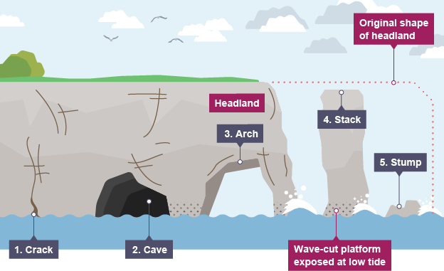 - Caves: Initiated by wave action exploiting lines of weakness in the cliff, such as cracks or joints, caves form through the processes of hydraulic action and abrasion.